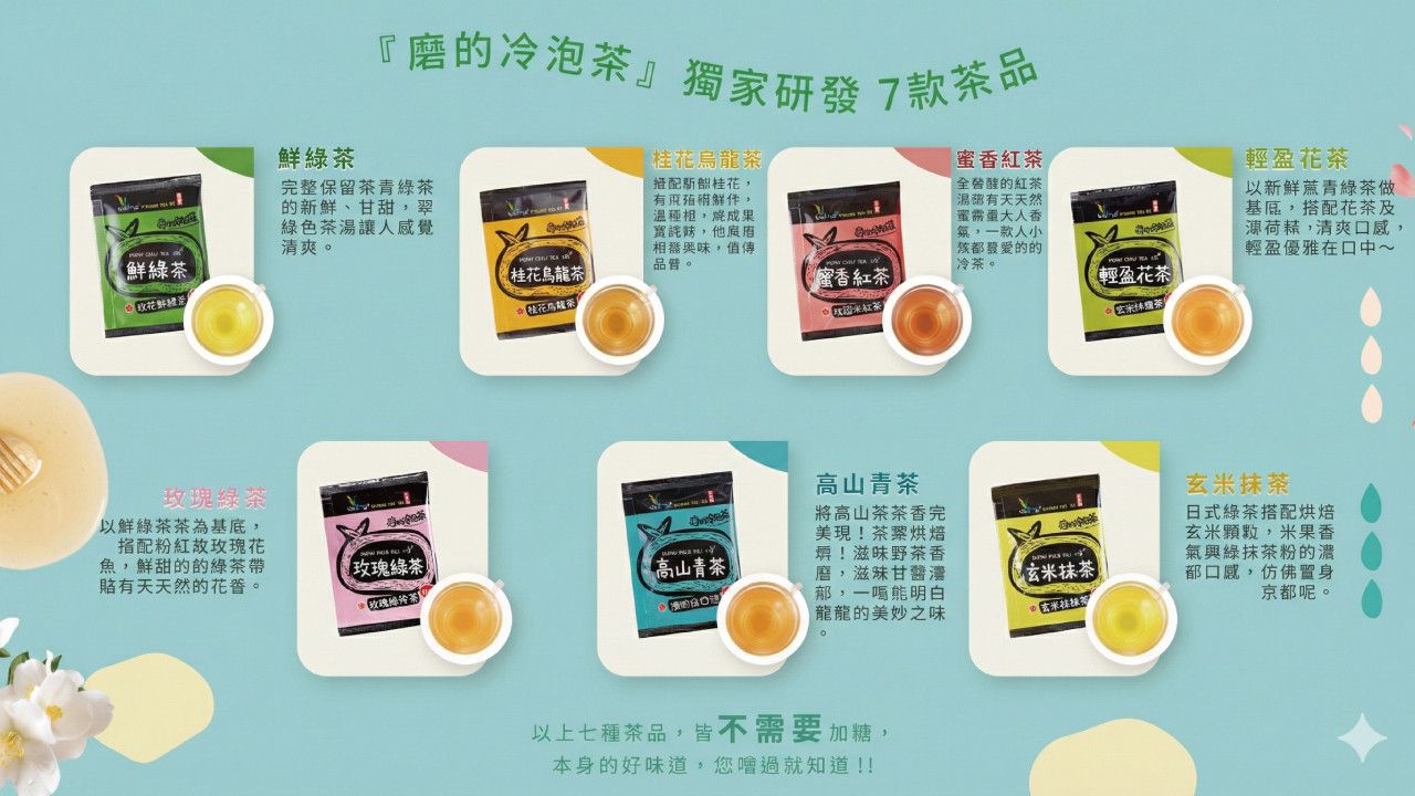我們的冷泡茶,從最初的 2 款,到現在的 7 種風味:紅茶、綠茶、烏龍、青茶,從不發酵到全發酵,從輕焙到重焙,還有花草根莖的複方茶,每一種都是我們親自試過、調整過、覺得最合適才推出的原創配方。