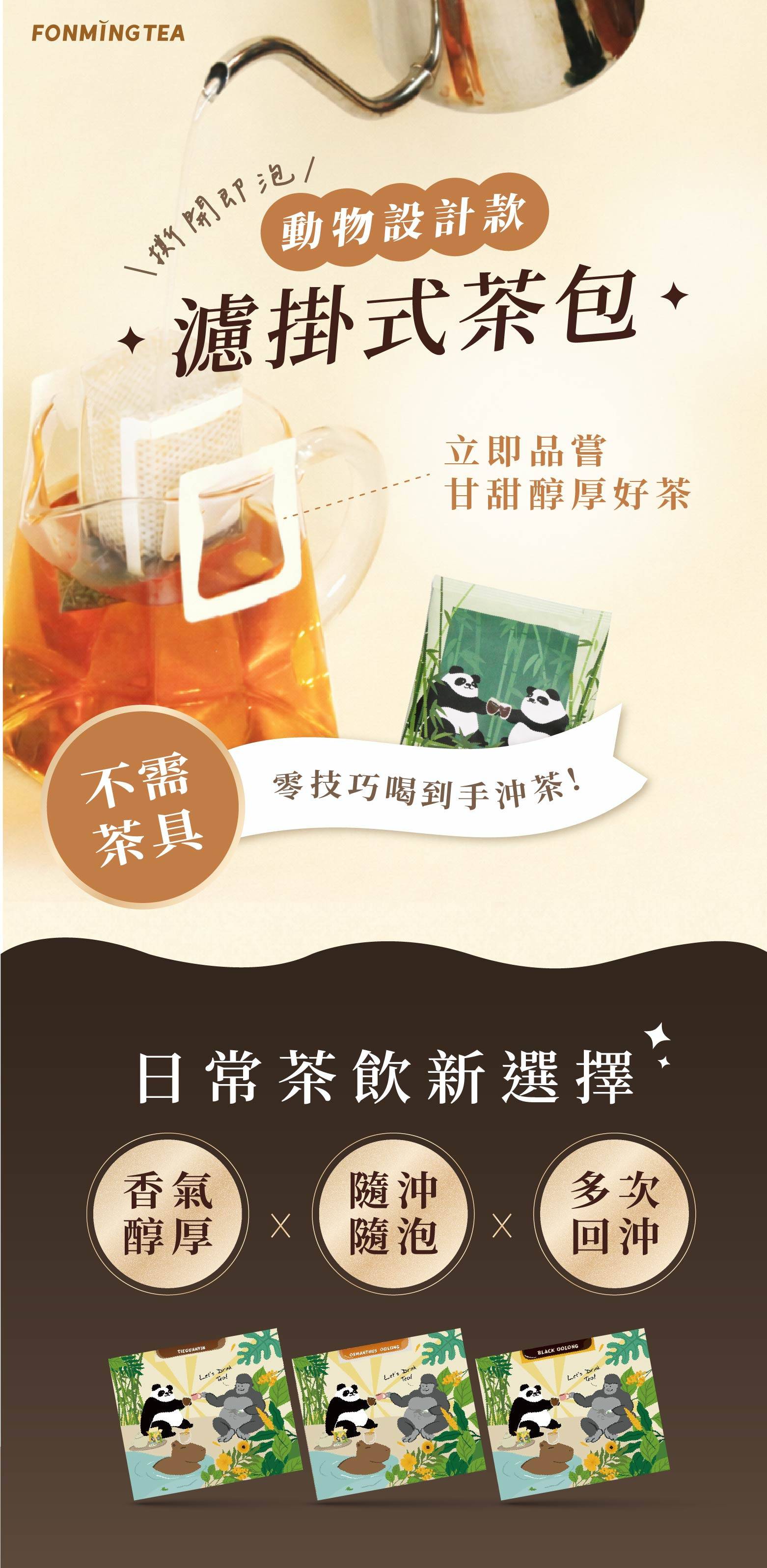 動物園裡的大貓熊先生、金剛叔和水豚君以濾掛式茶包相聚,