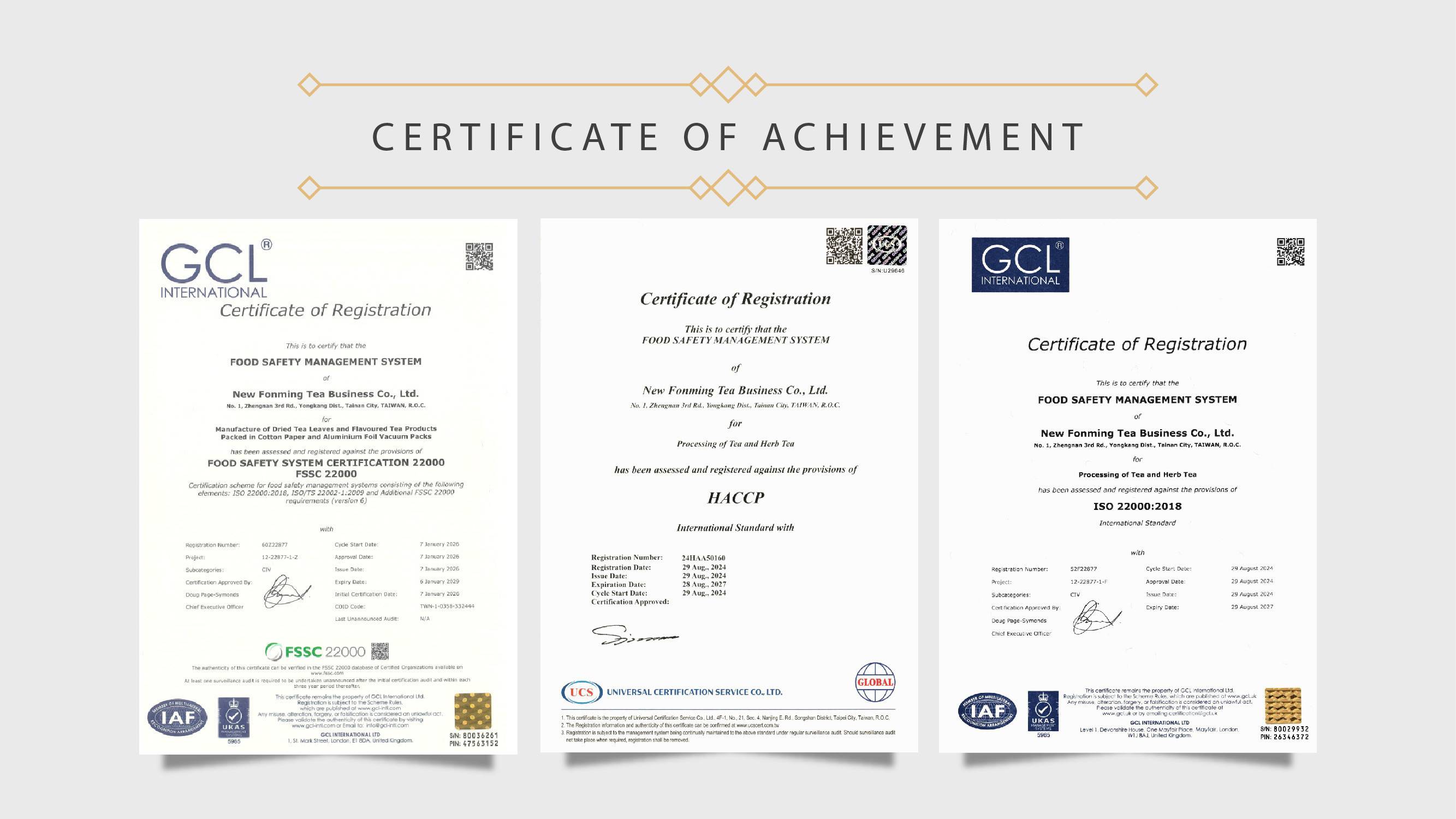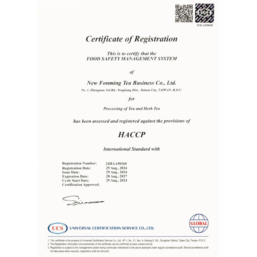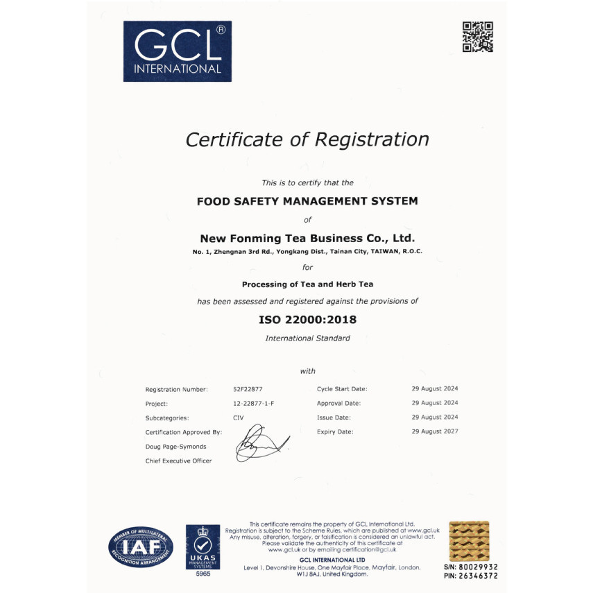 Our tea factory is the first in Taiwan to achieve dual certifications in food safety: ISO22000 and HACCP.
