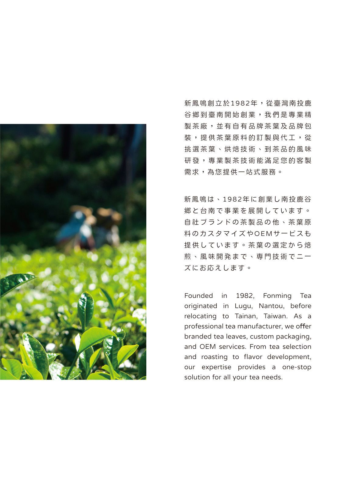 Fonming Tea Co., established in 1982, specializes in tea wholesale, raw material supply, OEM services, and custom tea product development.
