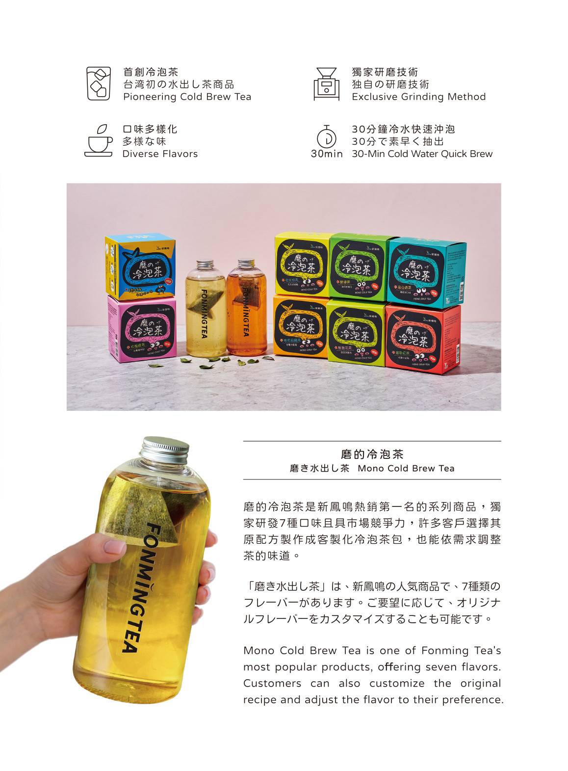 台湾産の原片茶葉を基盤とし、独自の研磨技術と冷泡製法を融合させ、豊富な茶葉ラインナップとギフトシリーズを展開しています。