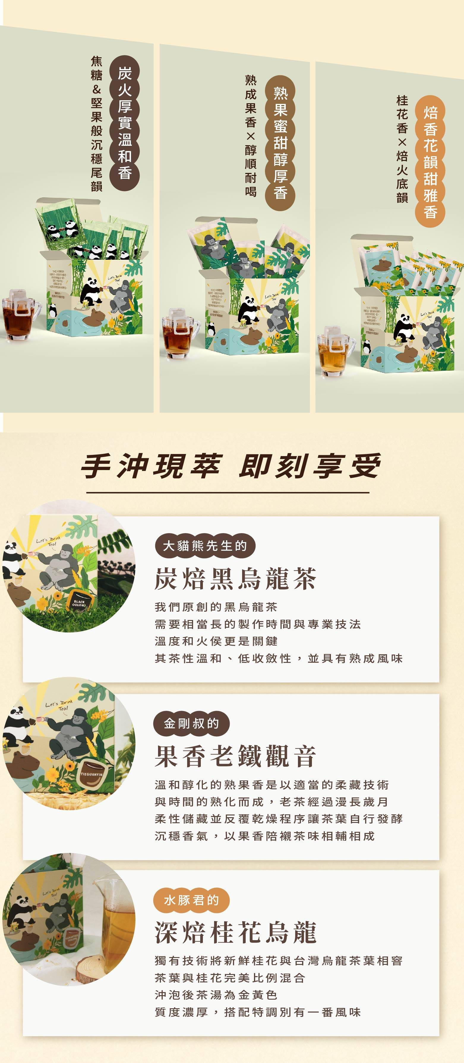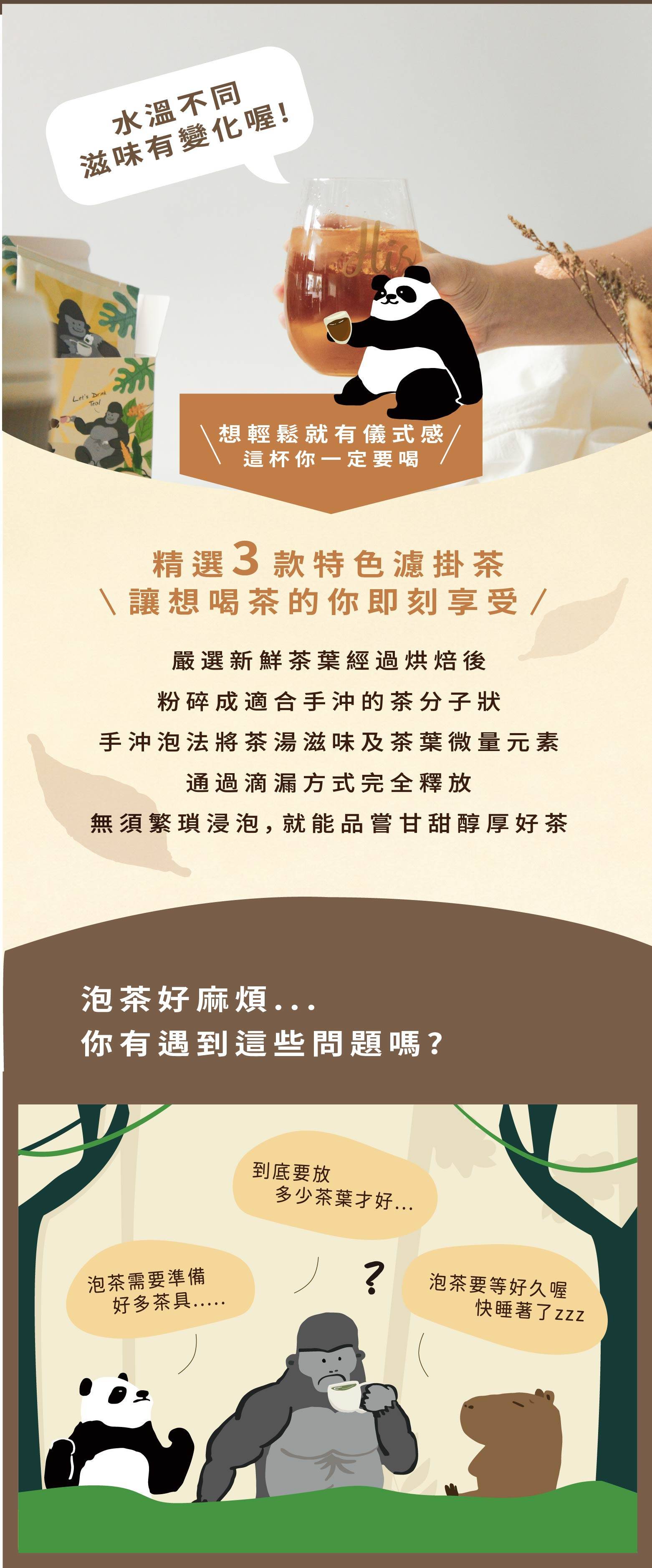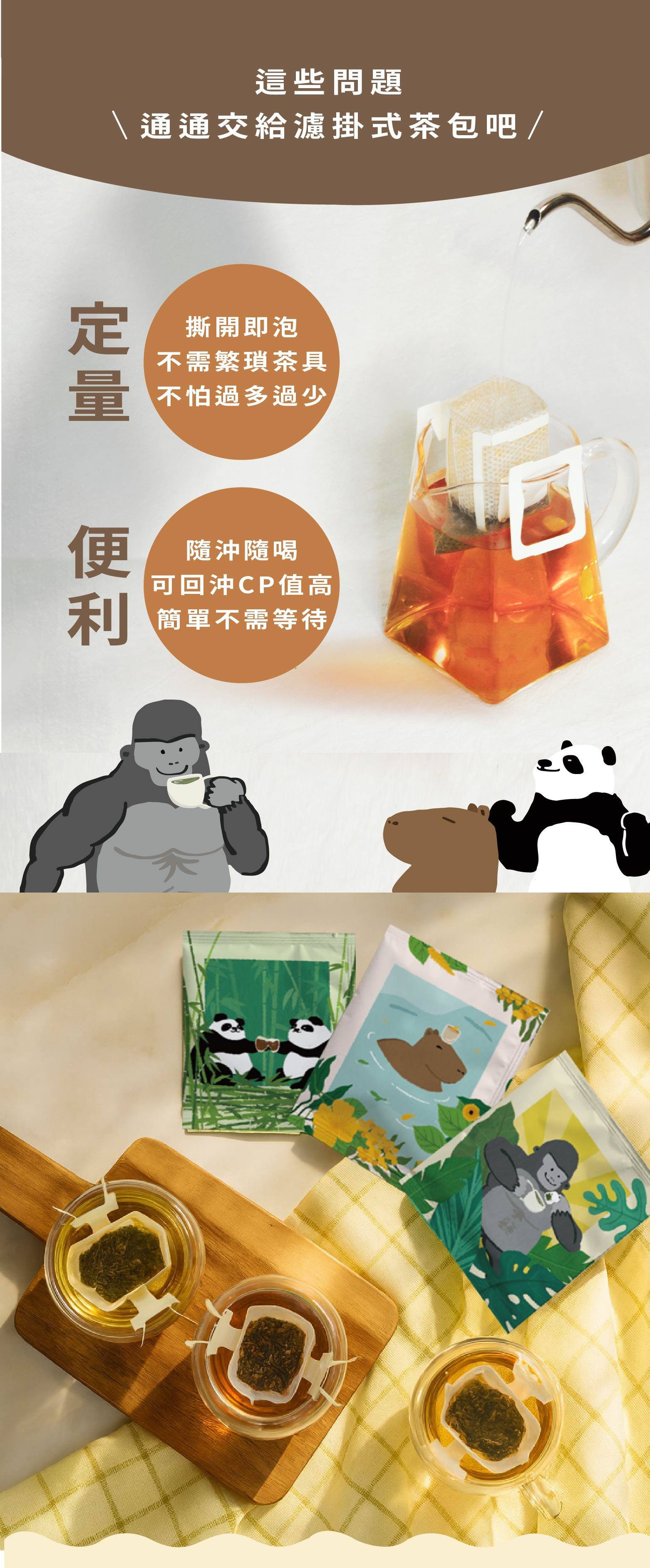 動物園裡的大貓熊先生、金剛叔和水豚君以濾掛式茶包相聚,